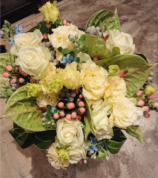(白薔薇、トルコ桔梗、ピペリカム、シルバーブローニア、アンスリウム、ブルースター)
