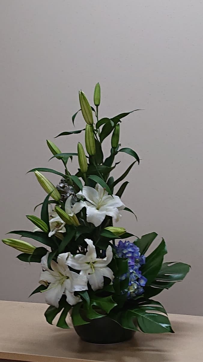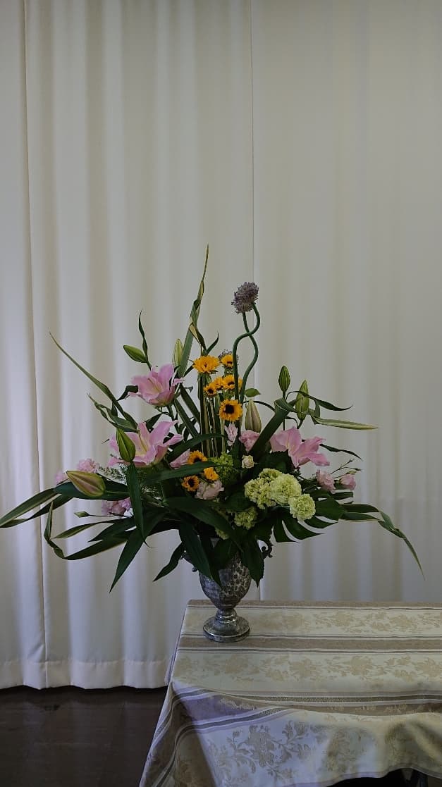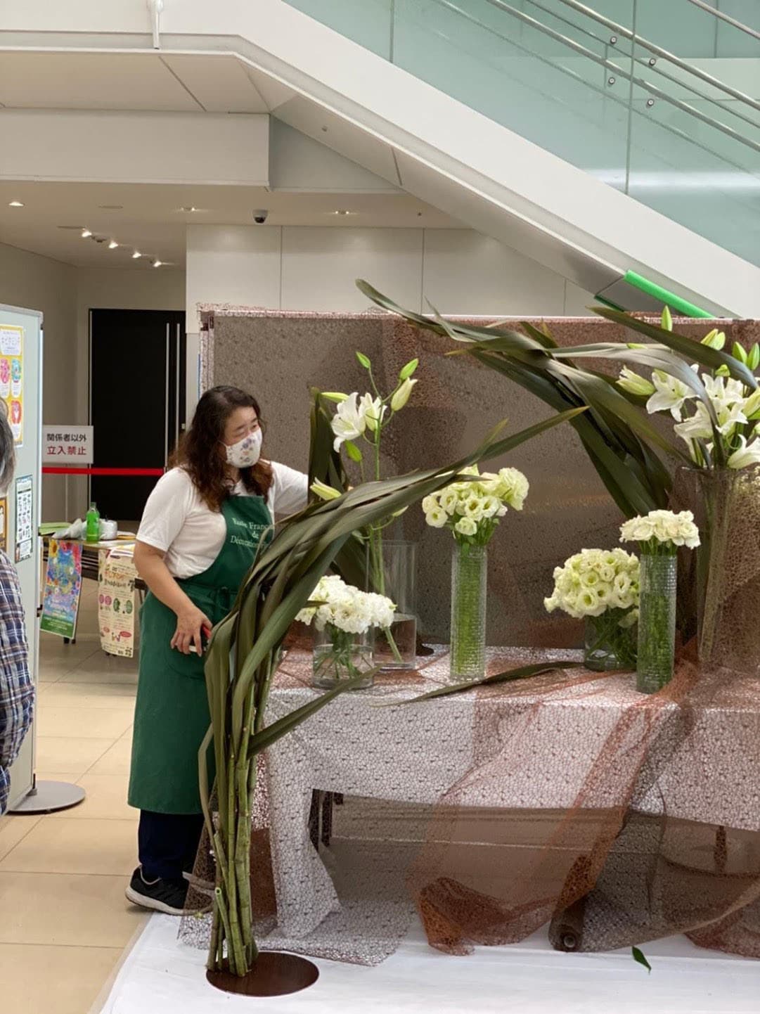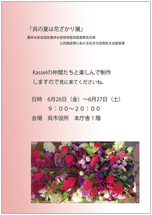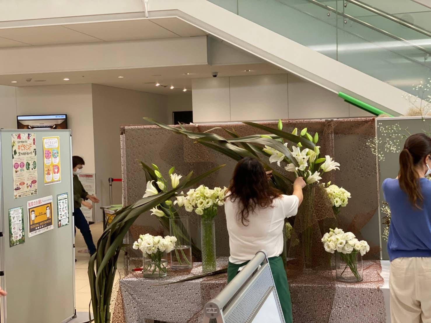 6月下旬にコロナでダメージを受けた生花、苗物の生産者の方々を助けようという国からの支援に賛同しボランティアで生徒さんたちと一緒に呉市役所ロビーにお花を飾りました。